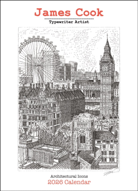 "Each drawing is assembled from a variety of characters, letters and punctuation marks using the forty-four keys of a typical typewriter. Information is overlaid and the keys are tapped at variable pressures to achieve tonal shading." —James Cook The James Cook Typewriter Artist 2026 Wall Calendar features images of iconic landmarks and places such as the Arc de Triomphe in Paris, theColosseum in Rome, the Royal Albert Hall in London, and the Empire State Building in New York City. Concealed in most drawings are hidden typewritten messages or words inspired by the backstory of each project. The oversized calendar provides plenty of space to add your own special occasions, appointments, and reminders. Features include: 10.5" x 14.5" (10.5" x 29" open) Cover design eliminates need for plastic packaging Printed on FSC® certified paper with soy-based ink Planning spread for September–December 2025 Spans January–December 2026 Generous grid space for notes, appointments, and reminders Official major world holidays and observances Moon phases, based on Universal Time Typewriter "drawings" of well-known architectural landmarks created by James Cook