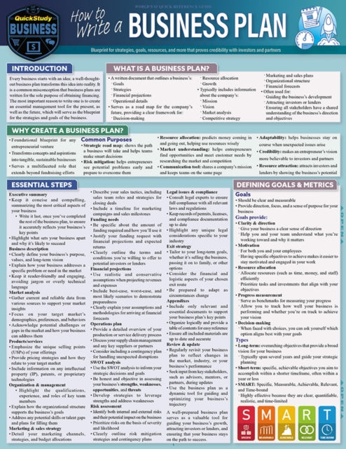 Essential guide to writing the business plan that will transform your idea into reality. Creation of a blueprint for strategies and goals will become a critical management tool for the present and future of your business giving you a detailed written plan allowing others like possible partners and investors to see your vision and specifics of the potential. Author, professor, senior executive, and business consultant Dr. Kyle Allison uses his 20 plus years of multi-faceted knowledge and real-world experience to give you succinct need-to-know facts in our famous QuickStudy format that offers more quality answers per page than any other source. The value of this knowledge at this reasonable price is unmatched as a good business plan can be the gateway to a new business and life, with you as the boss.