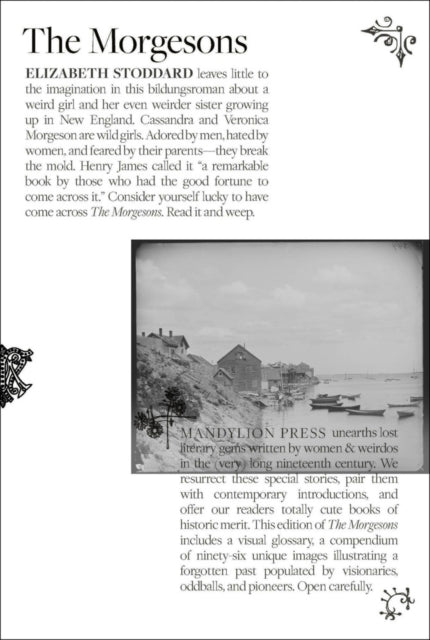 Stoddard leaves little to the imagination in this startling New England bildungsroman about a strange girl and her even stranger sister Cassandra and Veronica Morgeson are wild girls. Adored by men, hated by women and feared by their parents—they break the mold. Veronica refuses to leave the family hearth or look at the ocean. Cassandra travels from one house to another around Massachusetts, breaking hearts and sending men to their deaths wherever she goes. She narrates it all in a bold voice that will surprise and shock even those most familiar with 19th-century literature. Henry James called The Morgesons "a remarkable book by those who had the good fortune to come across it." As with all of Mandylion’s bespoke publications, this new edition of Stoddard’s first novel includes a visual glossary that illuminates the social conventions and restrictions of the 19th century. Elizabeth Drew Barstow Stoddard (1823–1902) was the author of three novels, The Morgesons (1862), Two Men (1865) and Temple House (1867). These received mixed reviews and sold poorly in her lifetime, though her work received renewed interest at the end of her life. Her career underwent another critical reevaluation among feminist scholars in the 1970 and 1980s.