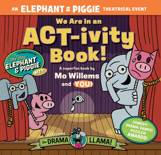 Mo Willems, #1 New York Times bestselling, award-winning author-illustrator, invites kids to take center stage in this one-of-a-kind theatrical event! Get your backstage pass to the world premiere performance of THE DAY ELEPHANT & PIGGIE MET! Readers discover how to be a set builder, prop maker, costume designer, playwright . . . and star of the show in this 144-page, ACTion-packed ACT-ivity book from Mo Willems and pals. Featuring host and theatre expert Drama Llama WingBang, plus Elephant and Piggie, The Pigeon, and an ensemble cast of characters, kids produce their own one-kid show from start to finish. Bonus features include perforated pages, cut-out props, mazes, games, coloring, posters, and a SUPER BOUNCE game board. And don’t miss the red-carpet (or living room–carpet) event of the year: The Pachyderm Awards!