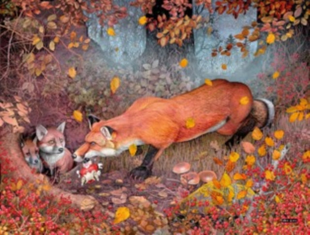 In this beautiful autumnal jigsaw puzzle we see a Mother Fox and her cubs in their burrow, but wait - what or who is she carrying? The roles are reversed in Tally Ho Ho.