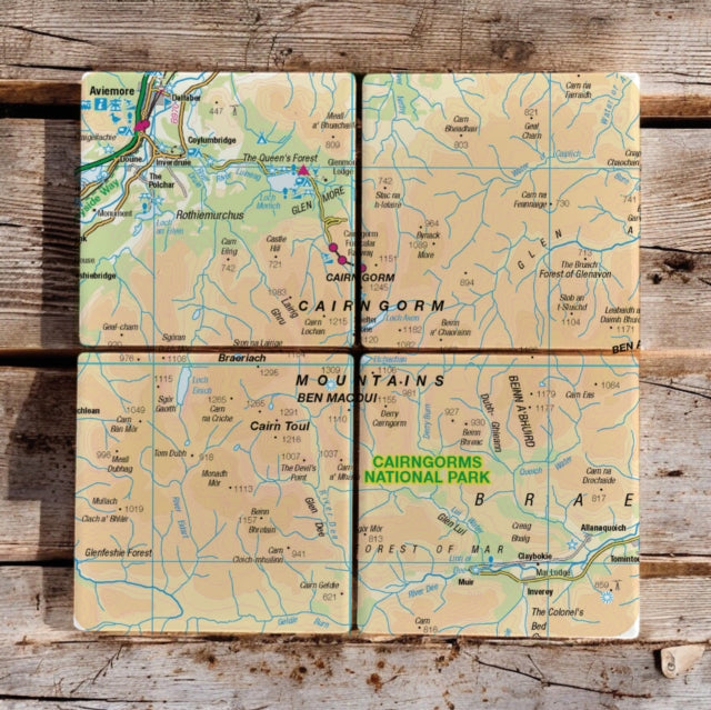 The OS Map Ceramic Four Coaster Set - Four coasters join together to make one map area - this licensed OS Map Ceramic Four Coaster Set is produced in the UK and celebrates the Cairngorms National Park
