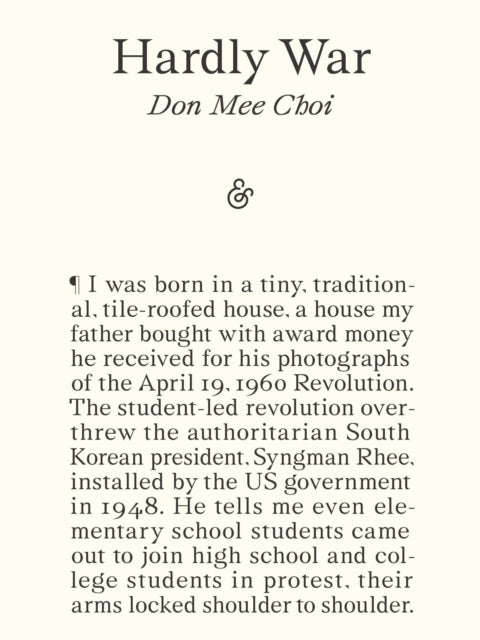 • Hardly War, Don Mee Choi's UK debut, defies categorisation. Using artefacts from Choi's father, a professional photographer during the Korean and Vietnam wars, she combines memoir, image, and opera to explore her paternal relationship and heritage. Here poetry and geopolitics are inseparable twin sisters. Suggestive and subtle in its connections and allusions, there is an exhilarating freedom in its playful form, all while looking straight at the brutality of colonialism and dictatorship. ‘A dark and upsetting but also funny-angry scrapbook . . . Choi has inherited her father’s journalistic sense for the right detail. She knows when to get out of the way and let the material speak for itself.’ Kathleen Rooney, The New York Times