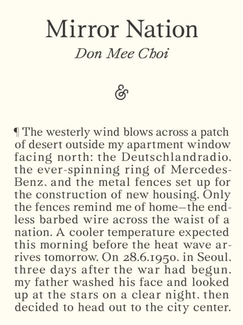‘Mirror Nation offers the best of what poetry can provide—a new way of seeing.’ Firecracker Awards, Don Mee Choi delves into South Korea’s violent recent history, particularly the military’s massacre of hundreds of students taking part in the 1980 Gwangju Uprising, in a poetry of grief that is both personal and collective. Mirror Nation is a sorrowful reflection on the ways in which a place can hold a ‘magnetic field of memory’. ‘Don Mee Choi draws on friendships, literature and documentary materials to elucidate the personal griefs we suffer under the assaults of empire. Formally explosive and emotionally harrowing, Mirror Nation is a riveting investigation into the coded images that fuse memories of different times and places.’ Forrest Gander, Poetry Society Book of the Year 2024 ‘From Ethiopia to Israel, Nicaragua to Afghanistan, she ties headlines and fragments using the equal sign, which she refers to as “a syntax that enables multiple places and times to coexist simultaneously.” Choi skilfully illustrates the cyclical, endless nature of violence to more deeply understand her home, herself, and the world.’ Publishers Weekly