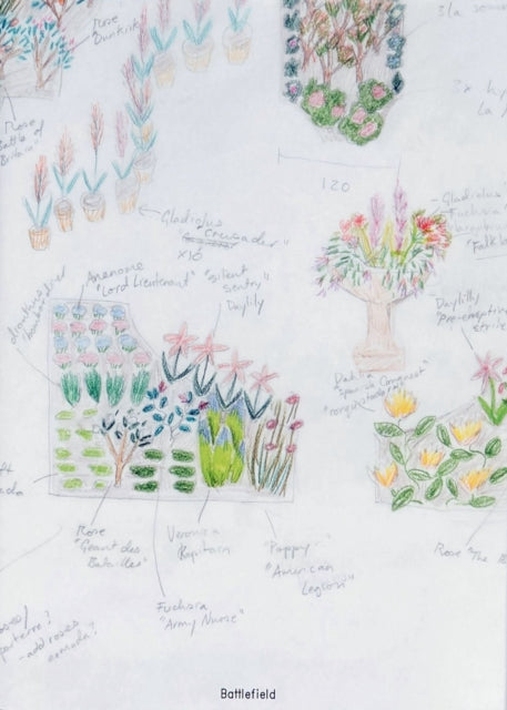 Battlefield is an artwork by Gabriella Hirst, a garden of plants whose officially registered cultivar names reference theatres of war, armed conflict and the military. The plant varieties were bred and given these names over the last 500 years by various nurseries and individual breeders, for example, Peony ‘Victoire de la Marne’ (registered and named in 1919), Rosa polyantha ‘Dunkerque’ (1950), Rosa floribunda “Atombombe” (1953). Hirst has been researching, assembling and tending to these plants since 2014 in the community gardens of the Tempelhofer Feld, Berlin, as part of a durational project questioning how the cultural memory of violent events is ‘gardened’. The histories represented in the Battlefield garden are weedy, overgrowing, and rhizomatic. As a long-term project requiring constant pruning, winter-care, pricking-out, sowing and reaping, the Battlefield project addresses entanglement of care and dominance in both western gardening practice and the historiography of war. The Battlefield publication includes an index of the stories behind every plant in the Battlefield living garden archive, including excerpts from email correspondence with plant societies, gardening blogs, horticultural archives, plant care tips, personal anecdotes and speculations alongside compiled ephemera and research material gathered from the Battlefield project from 2014 to the present day, in its current expanded installation at the Gedenstätte Augustaschacht, Ohrbeck. It features essays by curator and researcher Anja Lückenkemper and Gabriella Hirst, and a poster-dust jacket of the planting guide of Battlefield as installed at the Kunsthalle Osnabrück in 2022-23.