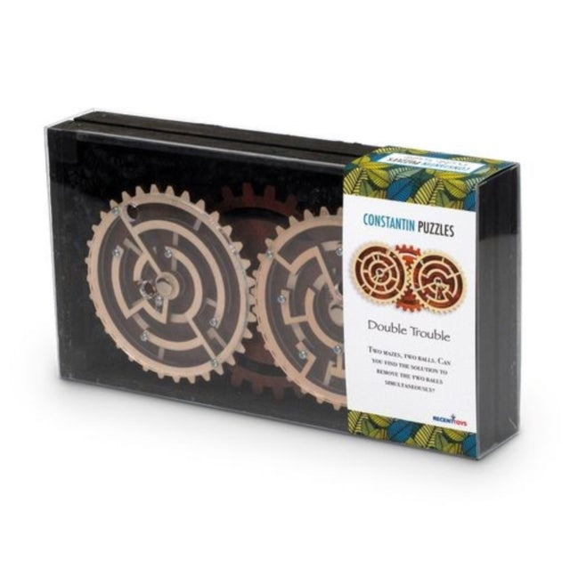 Two mazes, two balls, everything connected by giant gears. On their own, each maze is manageable. Can you find the way to remove both balls from the mazes simultaneously, though? Careful! The gears move at the same time, so a step towards the exit on one side may be a step backwards on the other.