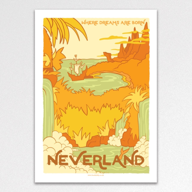 A high quality art print of Bookishly's vintage style travel poster of Neverland printed on high quality soft white card and displayed in a cello bag with a backing board.