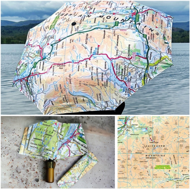 The OS Map Premium Umbrella - this licensed OS Map Premium Umbrella has a thick canopy, made from 100% UV protective material. The handle is made from top quality wood. It is produced in the UK and celebrates the Cairngorms National Park